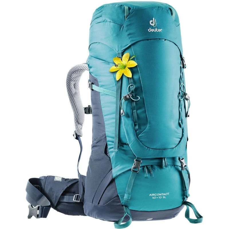 Robuste, confortable et bien Ă©quipĂ©, le modèle Deuter Aircontact 40+10 SL a tout ce qu’il faut pour de la randonnĂ©e sur tous les terrains et sous tous les climats. Sa couleur turquoise (Petrol Navy) et sa fleur jaune trahissent sa destination : c’est un sac Ă dos femme. Le confort de portage a Ă©tĂ© pensĂ© pour les femmes : dos un peu plus court qu’un modèle homme, bretelles plus fines et plus Ă©vasĂ©es pour dĂ©gager la zone de la poitrine et ceinture lombaire avec stabilisateurs qui Ă©pousent mieux les hanches fĂ©minines. Il s’agit d’un dos Aircontact : le contact avec le dos est optimisĂ©, l’air circule mieux et la transpiration est davantage limitĂ©e. La pluie n’est pas un problème : le sac Deuter Aircontact 40+10 SL possède une petite poche contenant une housse pluie Rain Cover. Poids total : 2170 g.